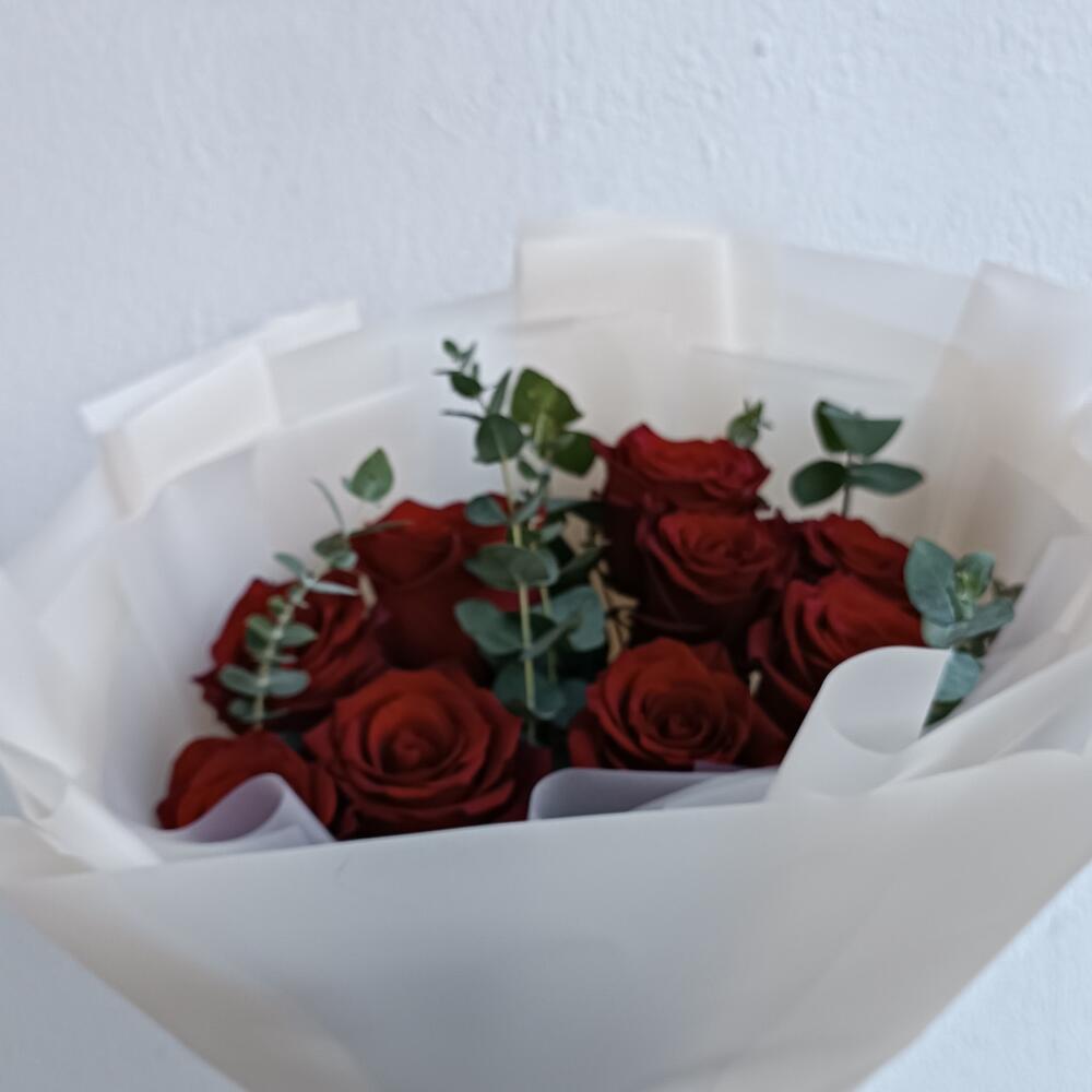 Самый страстный классический вариант бордовых роз с крупным бутоном и ароматным эвкалиптом. Такой букет расскажет о ваших чувствах , подойдет для любого повода (день рождения , юбилей, просто выражение симпатии)