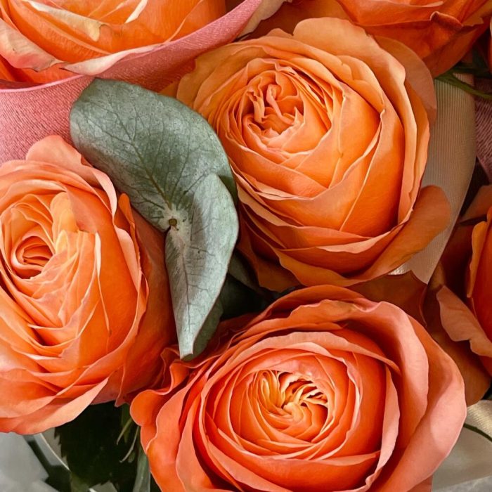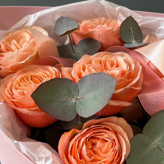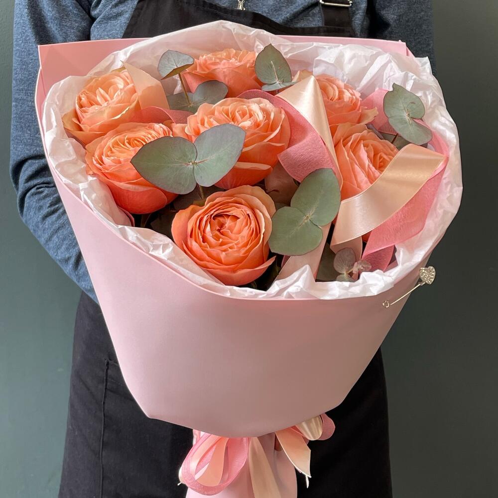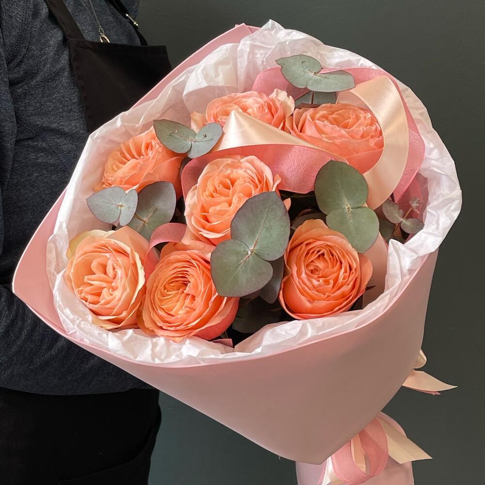 Лента – 1 шт.Эвкалипт – 2 шт.Роза одноголовая – 7 шт.Тишью – 1 шт.Упаковка дизайнерская – 1 шт.